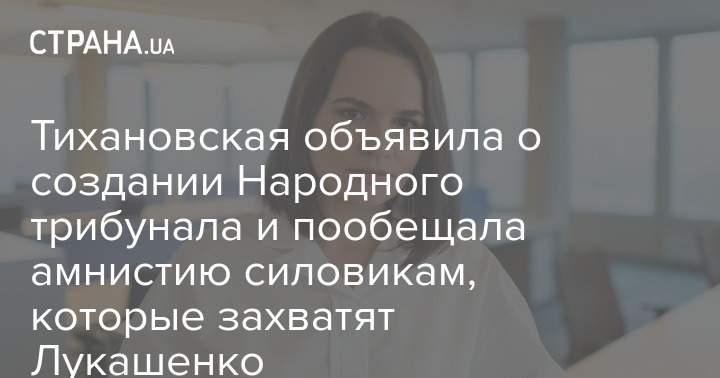 "Я, Светлана Тихановская, вместе с Народным антикризисным управлением объявляю Народный трибунал и амнистию за захват Лукашенко и членов его террористической группировки. Если государственная судебная система не работает, мы справимся без нее", - говорится в сообщении.