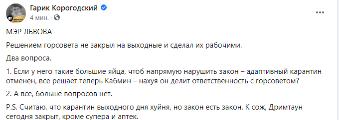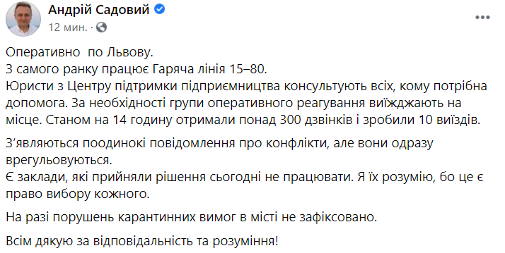 14:12  Андрей Садовой заявил, что нарушений карантина во Львове нет. А юристы выезжают на помощь предпринимателям (видимо, чтобы помогать им в разборках с полицией).