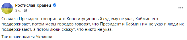 13:05  Юрист Ростислав Кравец пишет, что после незаконного предложения Зеленского разогнать конституционный суд, ему не стоит удивляться, что мэры открыто не исполняют решений центральной власти.