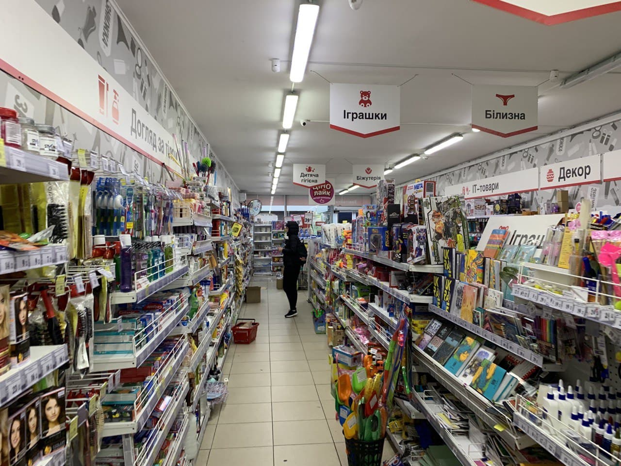 09:54  Магазин "Червоный маркет" возле метро Позняки, работает в обычном режиме. Он специализируется на хозтоварах, но наличие на кассе шоколадных батончиков, чипсов и жевательных резинок позволило магазину обойти карантин выходного дня.