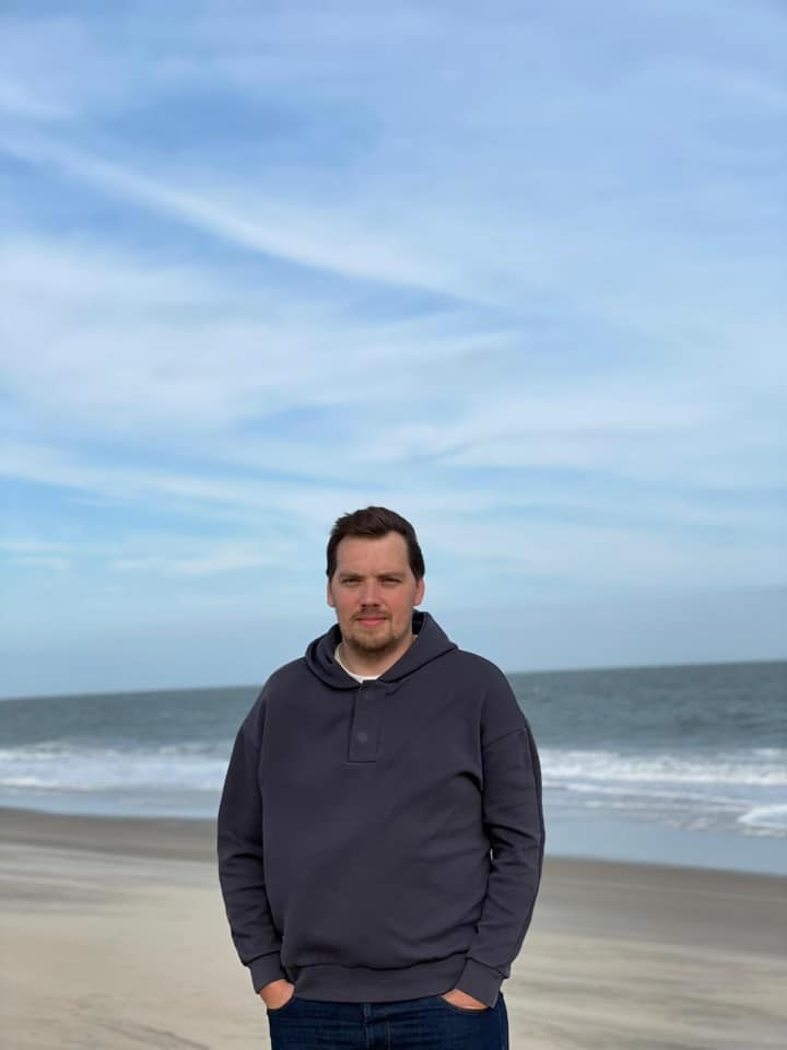 На нем он позирует на фоне морского пейзажа Рехобот-Бич в штате Делавэр.