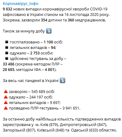 По состоянию на утро понедельника, 16 ноября, в Украине подтвердились 9 832 новых случая заражения коронавирусом. Напомним, что предыдущий антирекорд был отмечен в субботу, 14 ноября, когда за сутки в стране было выявлено 12 524 зараженных.