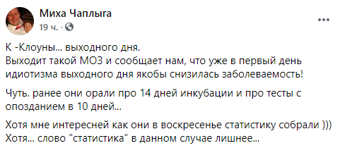 Выходит такой МОЗ и сообщает нам, что уже в первый день идиотизма выходного дня якобы снизилась заболеваемость!