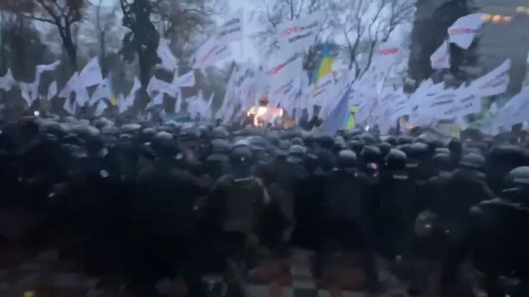 Сегодня, 17 ноября, протестующие украинские предприниматели пошли на прорыв здания парламента. Прорыв протестующих был остановлен, но они не расходятся. Сейчас полиция берет их в кольцо.