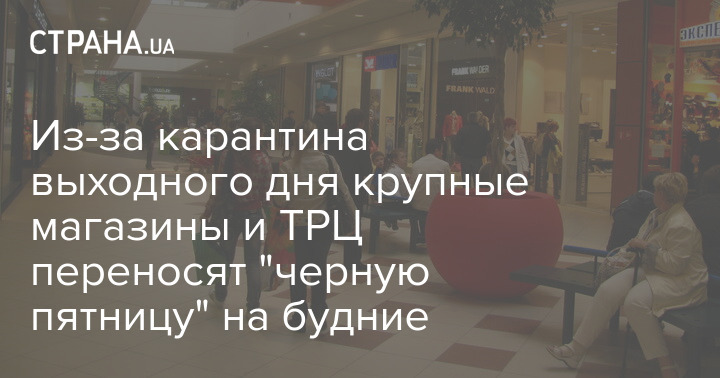 Многие украинские торгово-развлекательные центры (ТРЦ) переносят сроки проведение "черной пятницы" с выходных на будние дни, 23-27 ноября, из-за карантинных ограничений, которые действуют в субботу и воскресенье. Некоторые ТРЦ сократят срок проведение акции до одного дня.
