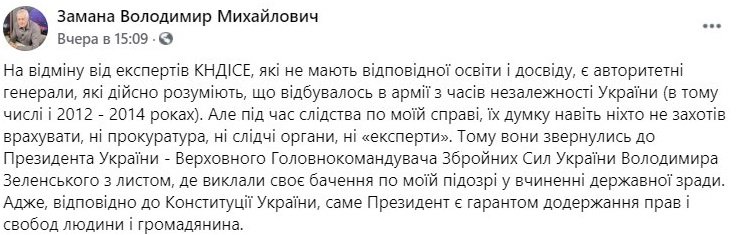 Соответствующее письмо опубликовал на своей странице в Facebook бывший начальник Генштаба ВСУ, генерал-полковник Владимир Замана, который сегодня является подозреваемым в госизмене за "сдачу Крыма".