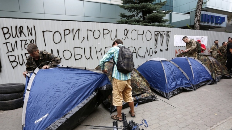 Сегодня, 5 сентября, в сгоревшем офисе телеканала "Интер" сотрудники пытаются навести элементарный порядок и заодно оценить нанесенный ущерб. В это время под их окнами уже который час разворачивается картина блокады. Здесь с утра толпятся радикально настроенные люди, которые угрожают блокировать здание, пока телеканал "Интер" не закроют.