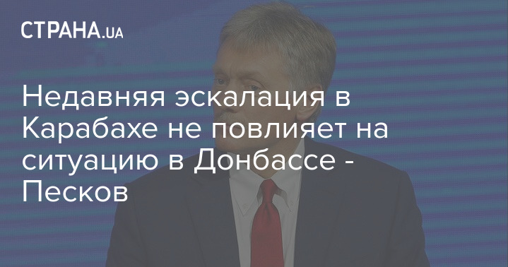 Пресс-секретарь президента России Дмитрий Песков не видит возможности обострения ситуации в конфликтном регионе Украины на фоне карабахского конфликта. Недавняя эскалация карабахского конфликта не дает оснований ожидать обострения ситуации на Донбассе.