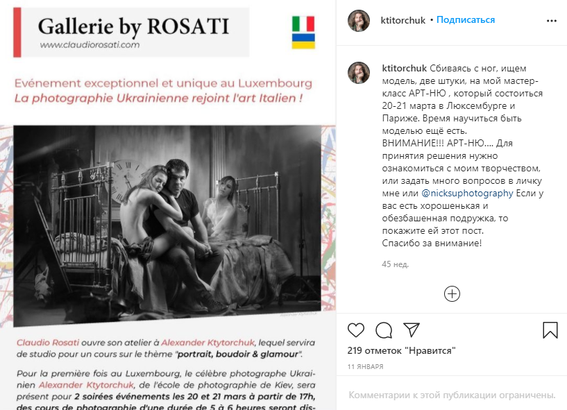 "Сбиваясь с ног, ищем модель, две штуки, на мой мастер-класс АРТ-НЮ, который состоится 20-21 марта в Люксембурге и Париже. Время научиться быть моделью ещё есть", - писал фотограф с мировым именем.