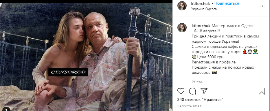 Отдельно он всегда предупреждал о жанре съемки: "Внимание АРТ-НЮ. Для принятия решения нужно ознакомиться с моим творчеством, или задать много вопросов в личку. Если у вас есть хорошенькая и обезбашенная подружка, то покажите ей этот пост", - писал Ктиторчук в январе этого года.