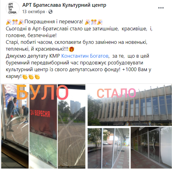 В оболонских пабликах пишут, что реконструкцию "Братиславы" контролирует семья Богатова. В принципе, арт-центр и не скрывал, что берет деньги у депутата.