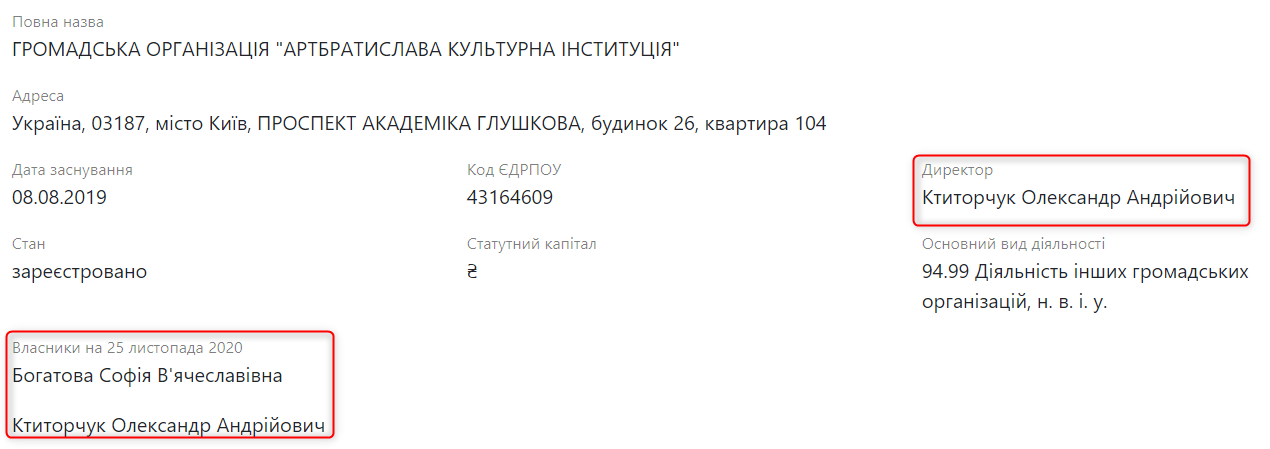 Ктиторчук является соучредителем и директором центра Art-Bratislava. Интересно, что вторым совладельцем выступает София Богатова - родственница депутата Киевсовета от "Голоса" Константина Богатова.