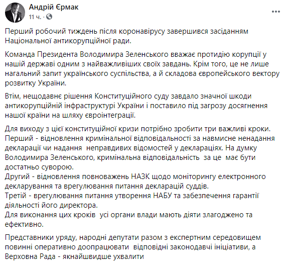 "Для выполнения этих шагов все органы власти должны действовать слаженно и эффективно. Представители правительства, народные депутаты вместе с экспертной средой должны оперативно доработать соответствующие законодательные инициативы, а Верховная Рада - как можно быстрее принять", - резюмировал глава ОП.