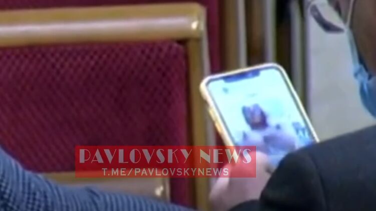 На опубликованных кадрах видно, что Евгений Петруняк сначала разговаривал по телефону, потом читал сообщения в мессенджере. Потом на экране появилось фото голой женской груди, которое, впрочем, уже через несколько секунд исчезло с дисплея смартфона. В это время рядом с ним выступал депутат от ОПЗЖ Григорий Мамка, которого и показывали во время трансляции.