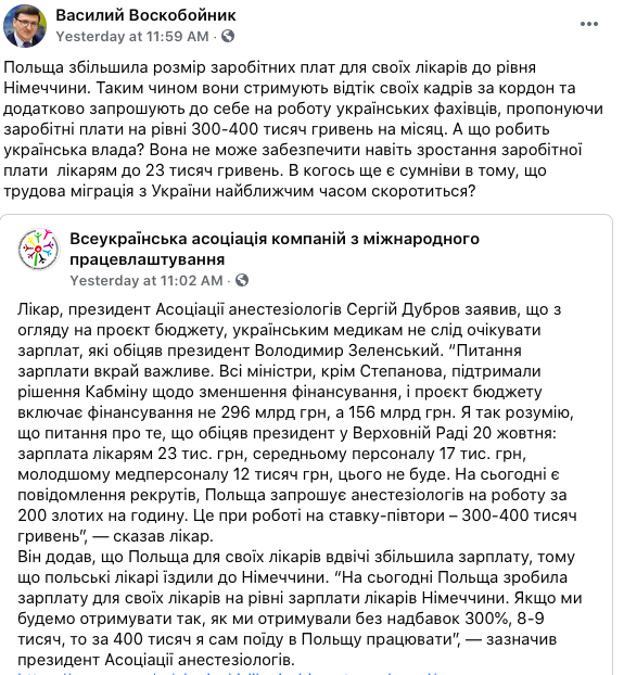 "Польша увеличила размер заработных плат для своих врачей до уровня Германии. Таким образом они сдерживают отток своих кадров за границу и дополнительно приглашают к себе на работу украинских специалистов, предлагая заработные платы на уровне 300-400 тысяч гривен в месяц. А что делает украинская власть? Она не может обеспечить даже рост заработной платы врачам до 23 тысяч гривен. У кого-то еще есть сомнения в том, что трудовая миграция из Украины в ближайшее время сократится?", - написал Воскобойник в Фейсбуке.