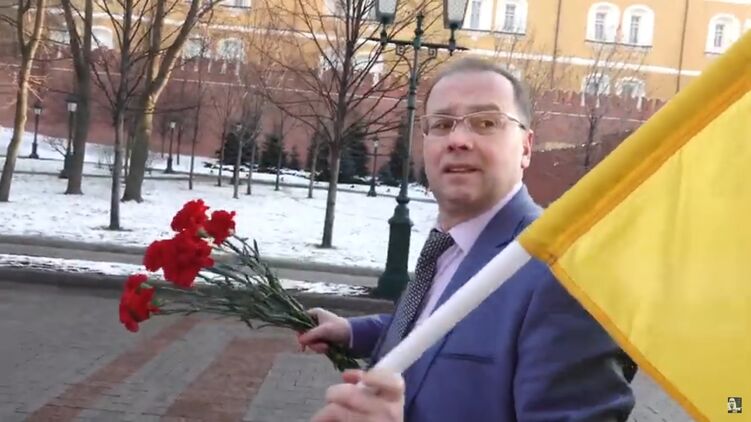 Юдин пришел в Александровский сад у Кремля с государственным флагом Украины и букетом гвоздик. Он приурочил свой пикет к 75-летию победы в Великой Отечественной войне и возложил цветы к монументу городам-героям.