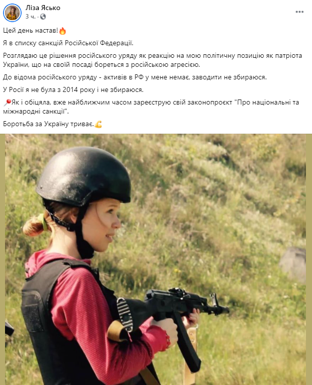 "Этот день настал! Я в списке санкций Российской Федерации. Рассматриваю это решение российского правительства как реакцию на мою политическую позицию как патриота Украины, что на своем посту борется с российской агрессией. К сведению российского правительства - активов в РФ у меня нет, заводить не собираюсь. В России я не была с 2014 года и не собираюсь. Как и обещала, уже в ближайшее время зарегистрирую свой законопроект "О национальных и международных санкциях". Борьба за Украину продолжается", - написала Ясько и приложила к посту свое фото с автоматом.