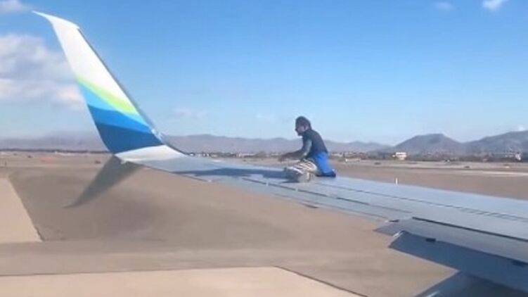 После того как мужчина свалился с крыла самолета на землю, его задержали правоохранители. Его доставили в местную больницу для осмотра. Предположительно установлено, что мужчина страдает психическим расстройством.