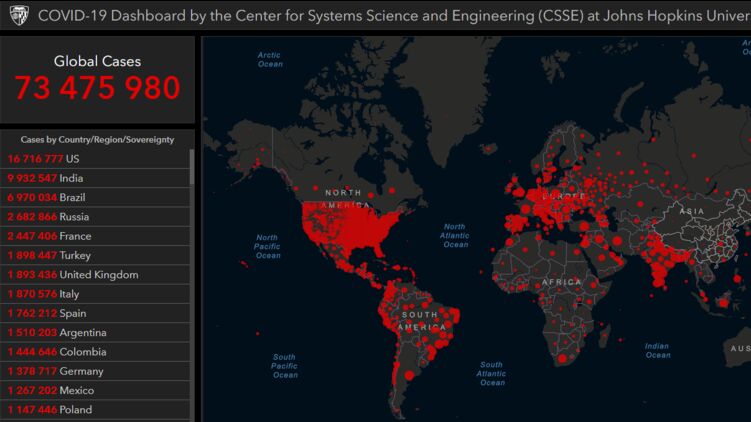 По данным на утро 16 декабря на Земле число зараженных уже 73,48 миллионов человек, фото: arcgis.com