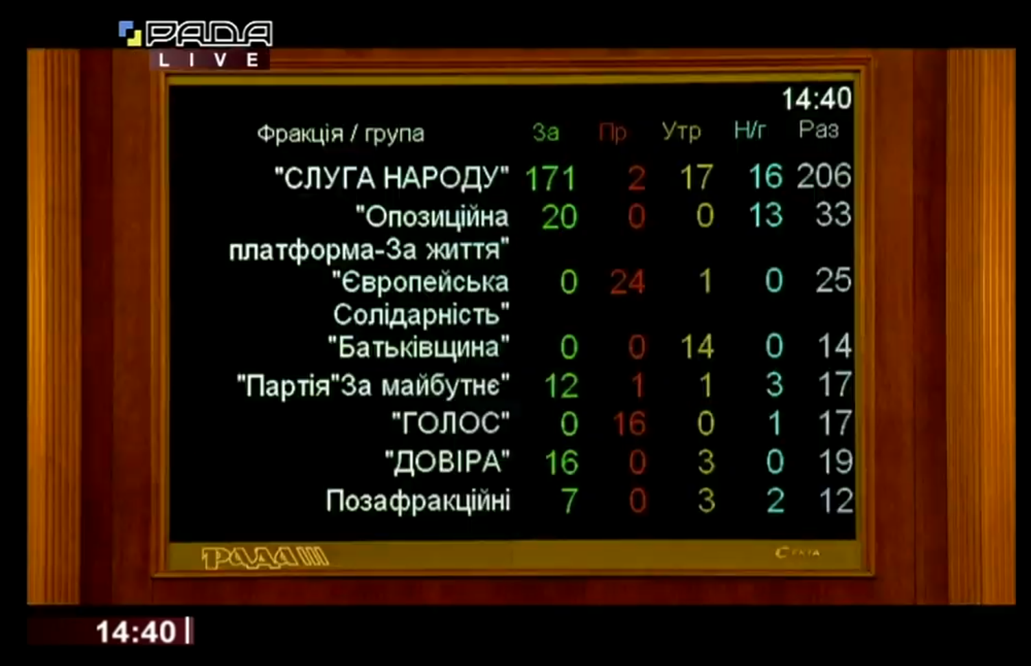 Так, от фракции "Слуга народа" кандидатуру поддержал 171 нардеп, от "Оппозиционной платформы - За жизнь" - 20, от партии "За будущее" - 12, от депутатской группы "Доверие" - 16, внефракционные депутаты отдали 7 голосов.