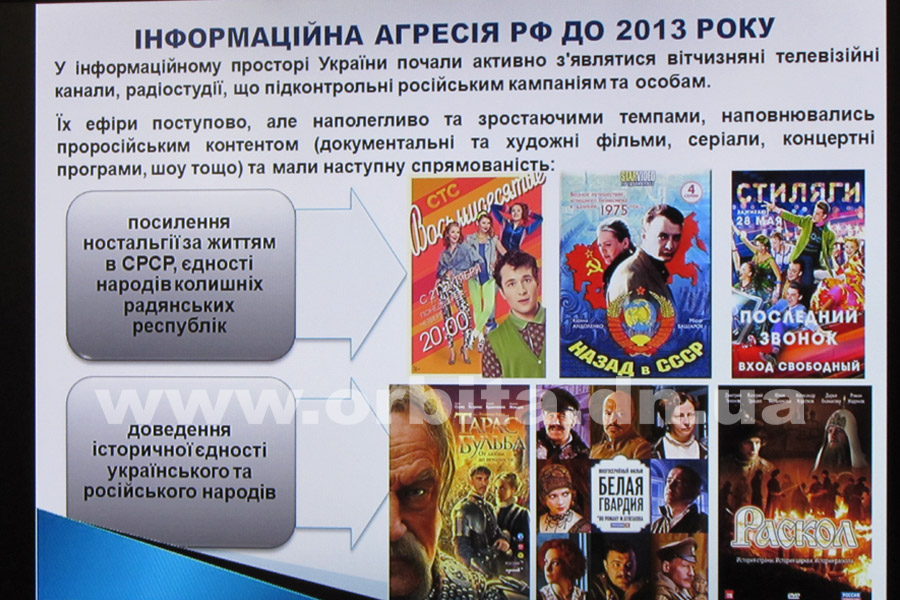 Вот с такой выставкой плакатов Лапутина ездила по Донбассу. На одном из плакатов, которые она привезла три года назад в Покровск, уже до 2013 года в Украине шла "информационная агрессия РФ". Она заключалась в "усилении ностальгии за жизнью в СССР, единством народов бывших советских республик".