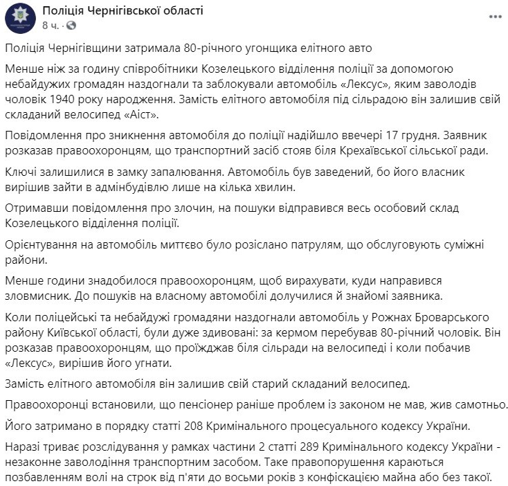 "Полиция Черниговщины задержала 80-летнего угонщика элитного авто. Меньше чем за час сотрудники Козелецкого отделения полиции с помощью неравнодушных граждан догнали и заблокировали автомобиль "Лексус", которым завладел мужчина 1940 года рождения. Вместо элитного автомобиля под сельсоветом он оставил свой складной велосипед "Аист", - указано в сообщении.