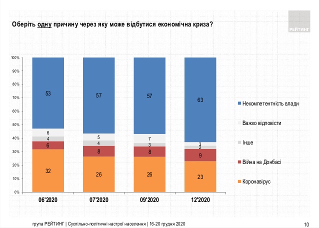 Причем списать ситуацию на коронавирус у властей уже не получается. Среди причин экономического кризиса более 60% украинцев называют некомпетентность власти, а не пандемию. И доля таких людей с лета выросла на десять процентов.