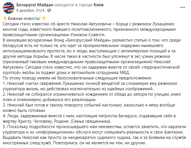 "Экс-политузник Николай Автухович с соратниками, которые и без внимания СМИ точно не пребывают в "овощном существовании", - писал "Белорусский Майдан" 6 декабря, за два дня до задержания активиста.