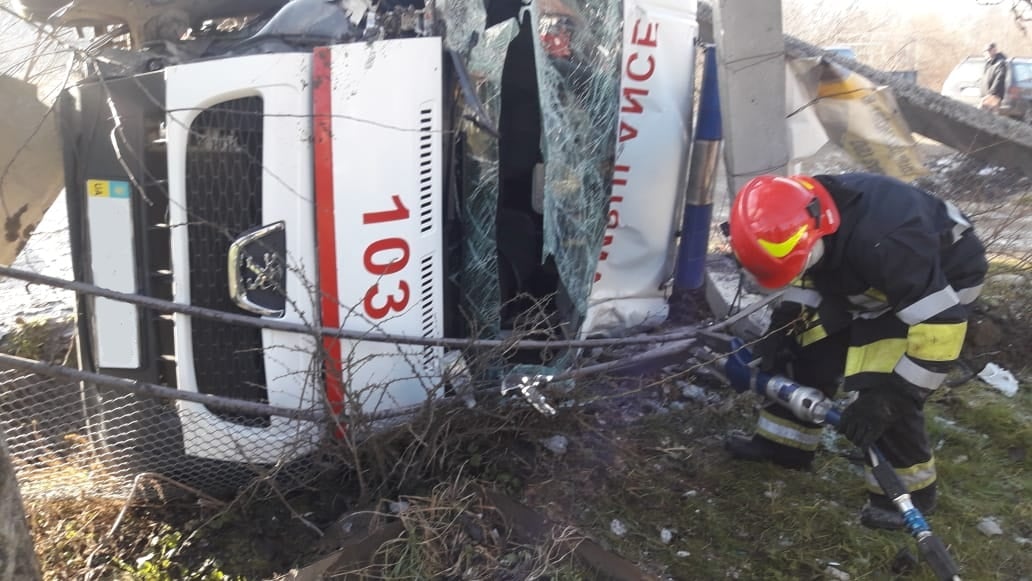 В результате столкновения с грузовиком автомобиль скорой медицинской помощи Peugeot Boxer перевернулся.