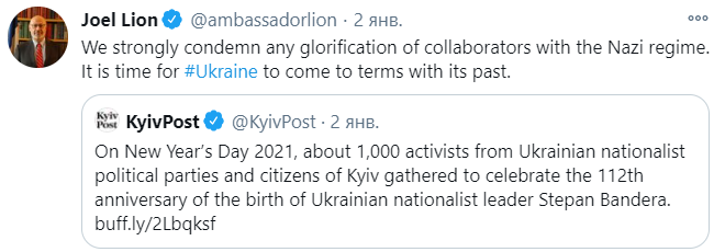 "Мы решительно осуждаем любое прославление пособников нацистского режима. Время для Украины примириться со своим прошлым", - прокомментировал посол новость о марше.