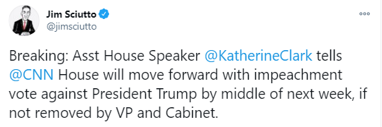 "Белый дом объявит импичмент президенту Трампу к середине следующей недели, если его не снимут вице-президент и Кабинет министров",- говорится в сообщении.