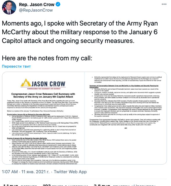 В США говорят об угрозе большой бойни. В частности, о готовящемся восстании 20 января предупредил министр армии США Райан Маккарти в разговоре с членом Палаты представителей Джейсон Кроу, о котором тот рассказал в своем Twitter.