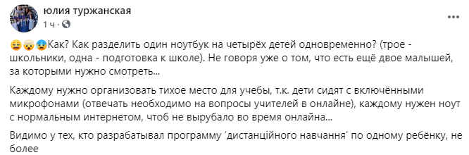 Видимо, у тех, кто разрабатывал программу ‘дистанційного навчання‘, по одному ребёнку, не более", - пишет подписчица группы "Батьки SOS" Юлия Туржанская.