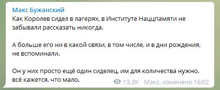 О том, что Королев для украинских властей - это лишь повод поговорить о сталинских репрессиях, написал нардеп Макс Бужанский.