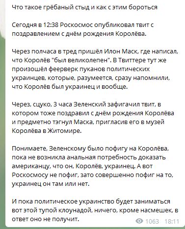 Через, сцуко, 3 часа Зеленский зафигачил твит, в котором тоже поздравил с днём рождения Королёва и предметно тэгнул Маска, пригласив его в музей Королёва в Житомире...