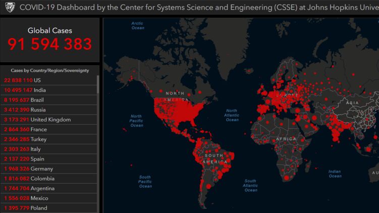 По данным на утро 13 января число зараженных в мире приближается к 92 миллионам, фото: arcgis.com