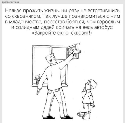 "Нельзя прожить жизнь, ни разу не встретившись со сквозняком. Так лучше познакомиться с ним в младенчестве, перестав бояться, чем взрослым и солидным дядей кричать на весь автобус: "Закройте окно, сквозит!", - написано на картинке в его аккаунте.