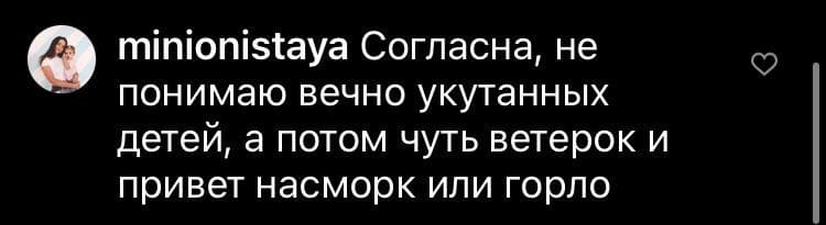 "Согласна, не понимаю вечно укутанных детей, а потом чуть ветерок и привет насморк и горло", - добавила еще одна девушка.
