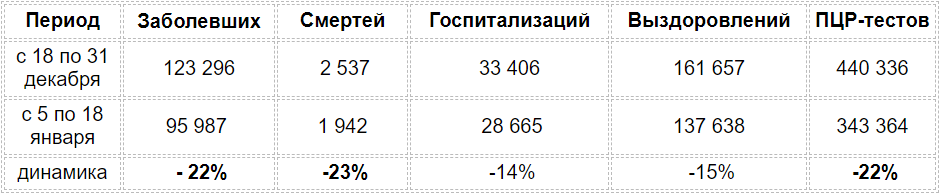 Так, если сравнить последние две недели декабря и последние 14 дней еще идущего января, то мы увидим - почти равномерно улучшились сразу все ключевые показатели: новые случаи, смерти, госпитализации.