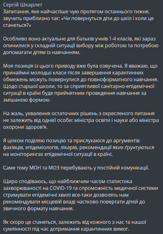 Еще на выходных министр образования Сергей Шкарлет написал пост в Телеграм, где расписал перспективы вернуться за парты после локдауна.
