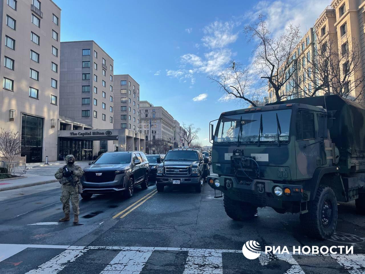 17:09 Центр Вашингтона перед инаугурацией: ограждения, военные, техника.