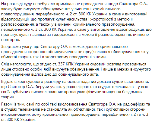 По данным суда, Алексей Святогор, которого обвиняли в распространении материалов, пропагандирующих культ насилия и жестокости относительно бездомных собак, был оправдан, так как следствие не смогло доказать его причастность в совершении правонарушения, предусмотренного статьей 300 Уголовного кодекса.