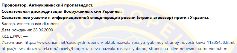 Вчера данные di.rubens с номером телефона и адресом внесли на скандальный сайт "Миротворец" с формулировкой "провокатор, антиукраинский пропагандист, сознательная дискредитация Вооруженных сил Украины, сознательное участие в информационной спецоперации России (страна-агрессор) против Украины".