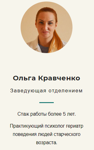 Когда еще была доступна группа пансионата "Золотое время", посты в ней часто публиковала некая Ольга Кравченко. Эта же девушка числится завотделением и в "Счастливой старости".