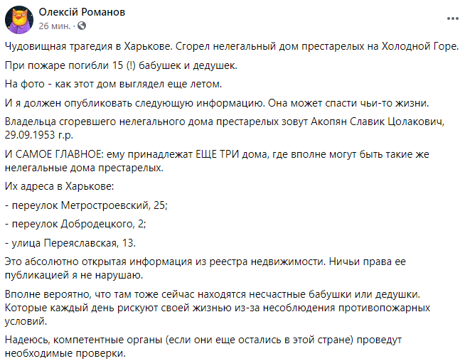 Харьковский журналист Алексей Романов написал у себя в Фейсбуке, что обоими домами престарелых на самом деле владеет местный предприниматель Славик Акопян.