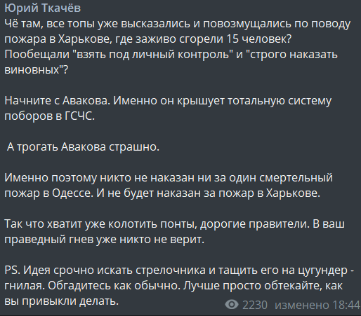 PS. Идея срочно искать стрелочника и тащить его на цугундер - гнилая. Обгадитесь как обычно. Лучше просто обтекайте, как вы привыкли делать", - пишет журналист Юрий Ткачев.