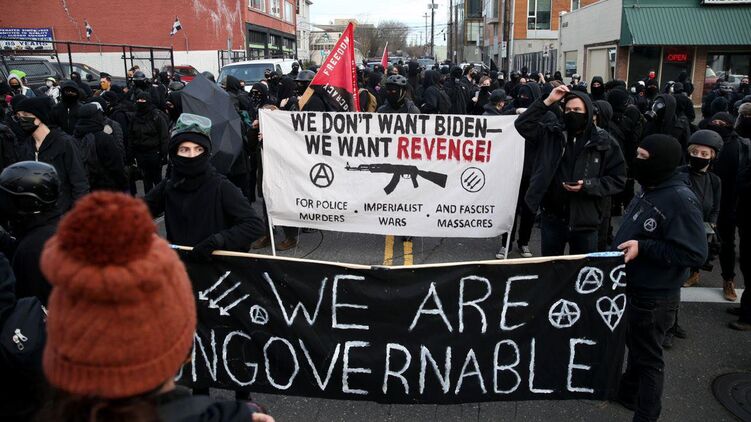 Сотни одетых в черное радикалов на днях громили в этом городе здания Демократической партии, разбивали окна и расписывали правительственные здания анархистскими символами. Они держали транспаранты "Над нами не может быть власти!","Не хотим Байдена - хотим отмщения: за убийства, совершённые полицией, империалистские войны и фашистские расправы".