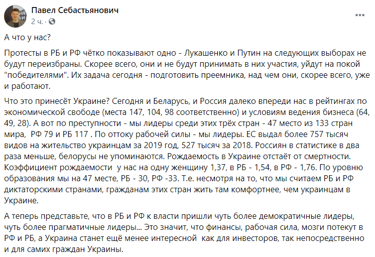 Предприниматель Павел Себастьянович пишет о том же, аргументируя, что Россия и Беларусь сейчас развиты лучше Украины. И если с них снимут санкции, то обе страны вырвутся еще дальше вперед.