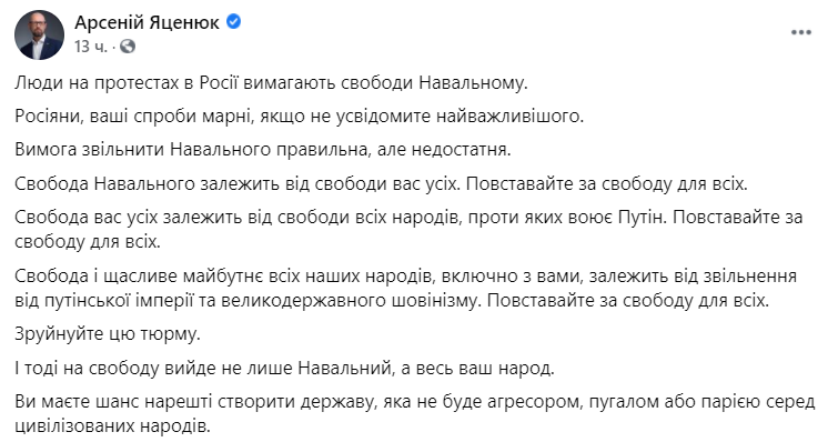 "Люди на протестах в России требуют свободы Навальному. Россияне, ваши попытки тщетны, если не осознаете главного.