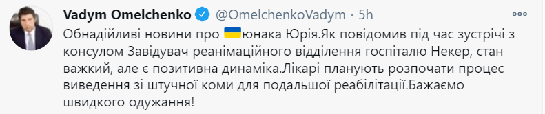 Спустя неделю после нападения посол Украины во Франции Вадим Омельченко написал в Твиттере, что есть обнадеживающие новости. Несмотря на то что состояние пострадавшего тяжелое, наблюдается положительная динамика и врачи планируют начать процесс вывода из искусственной комы для дальнейшей реабилитации.